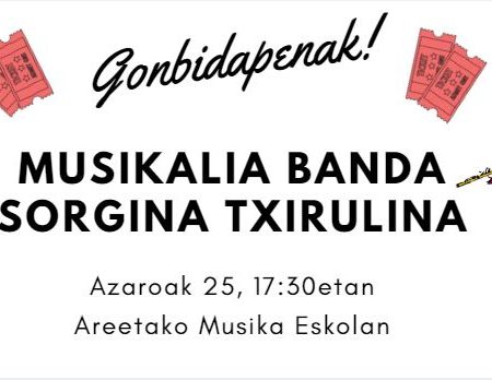 Kontzertua Areetako musika eskolan izango da, azaroaren 25ean arratsaldeko 17:30etan. Sarrera gonbidapenen bitartez kontrolatua egongo denez, hurrengo puntu hauetan eskuratu beharko dira: